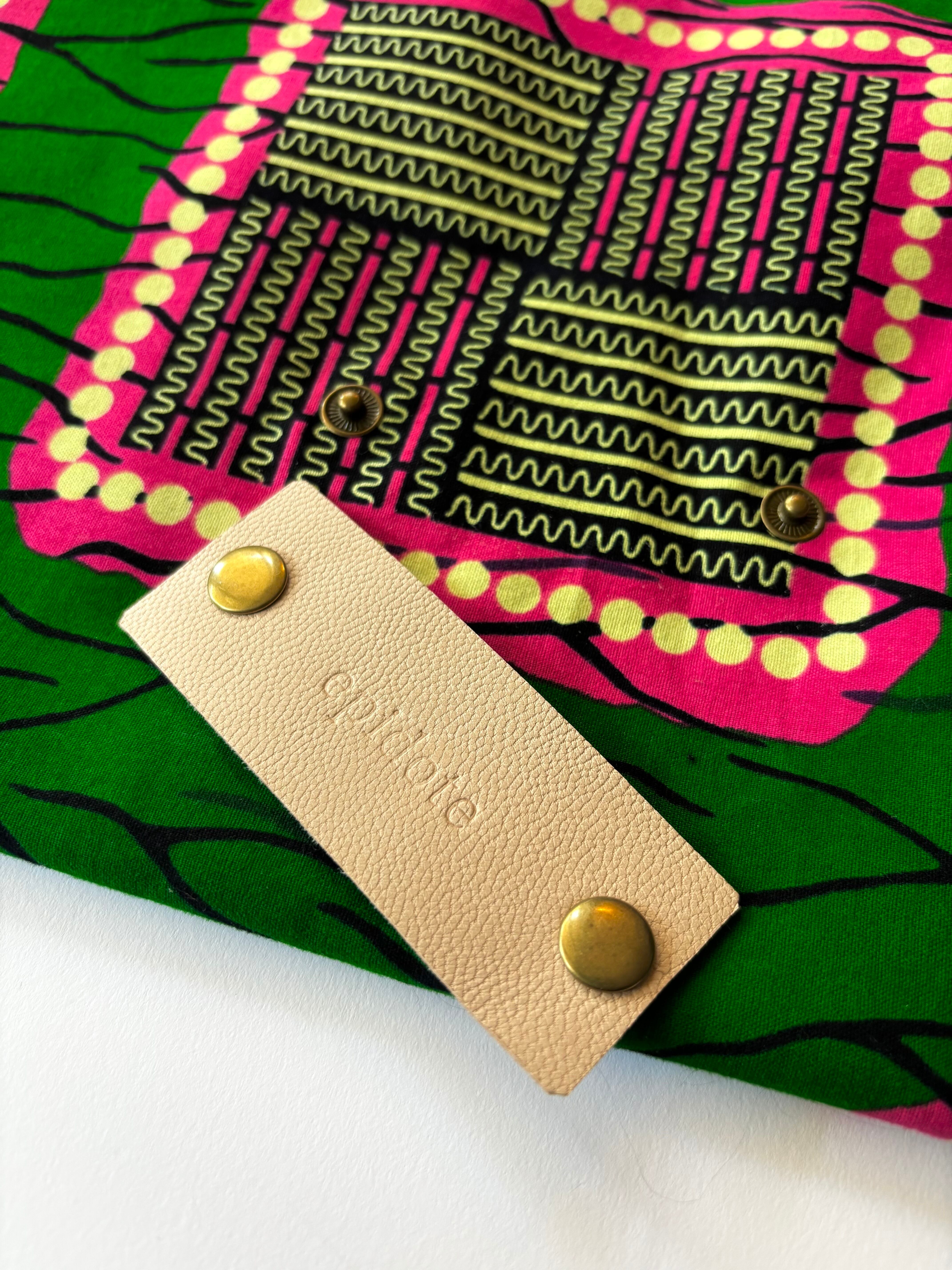 アフリカンプリントとゴートヌメ革を使用したバッグです。