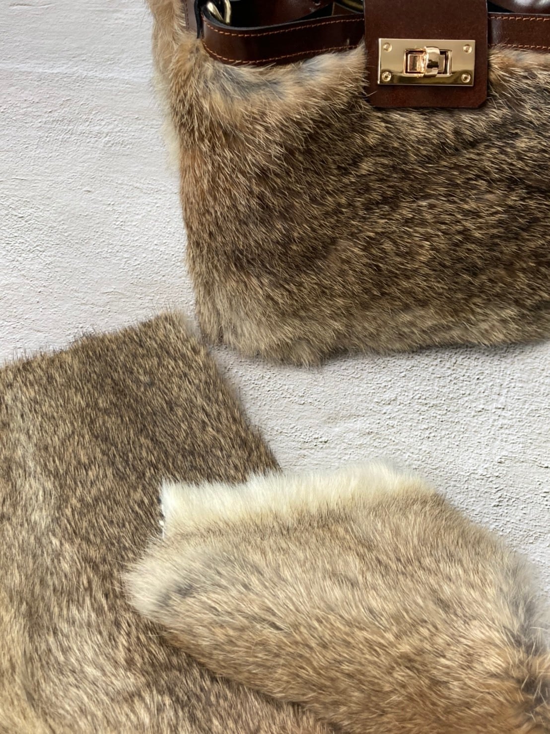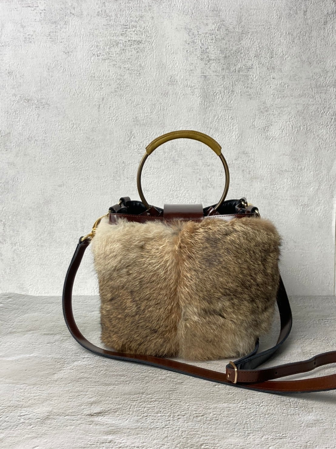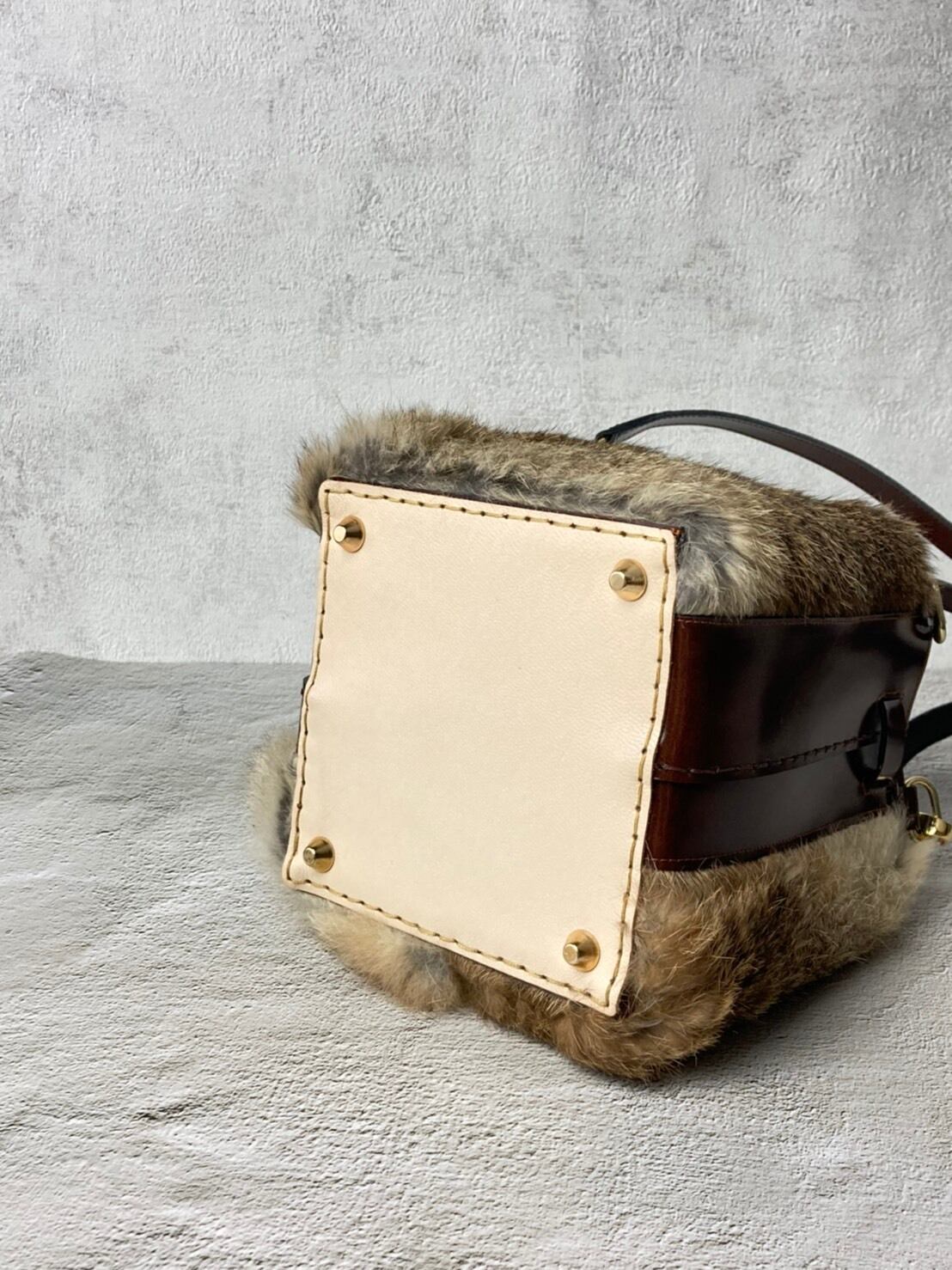 光沢感のある本牛革にリアルラビットファーをまとったバッグです。