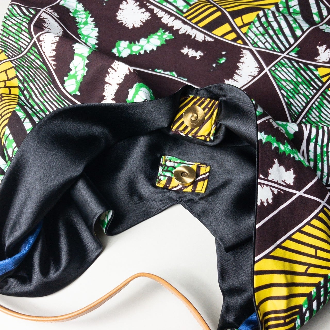 落ち着きがありながらも華やかで品のあるアフリカンプリントとゴートヌメ革を使用したバッグです。