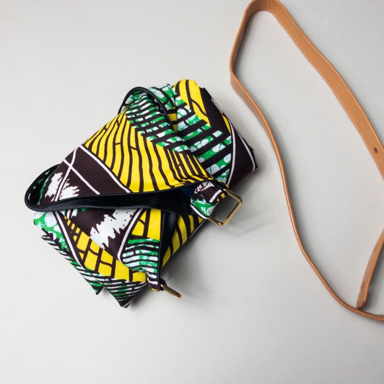 African print × Real leather Folding bag Brown
